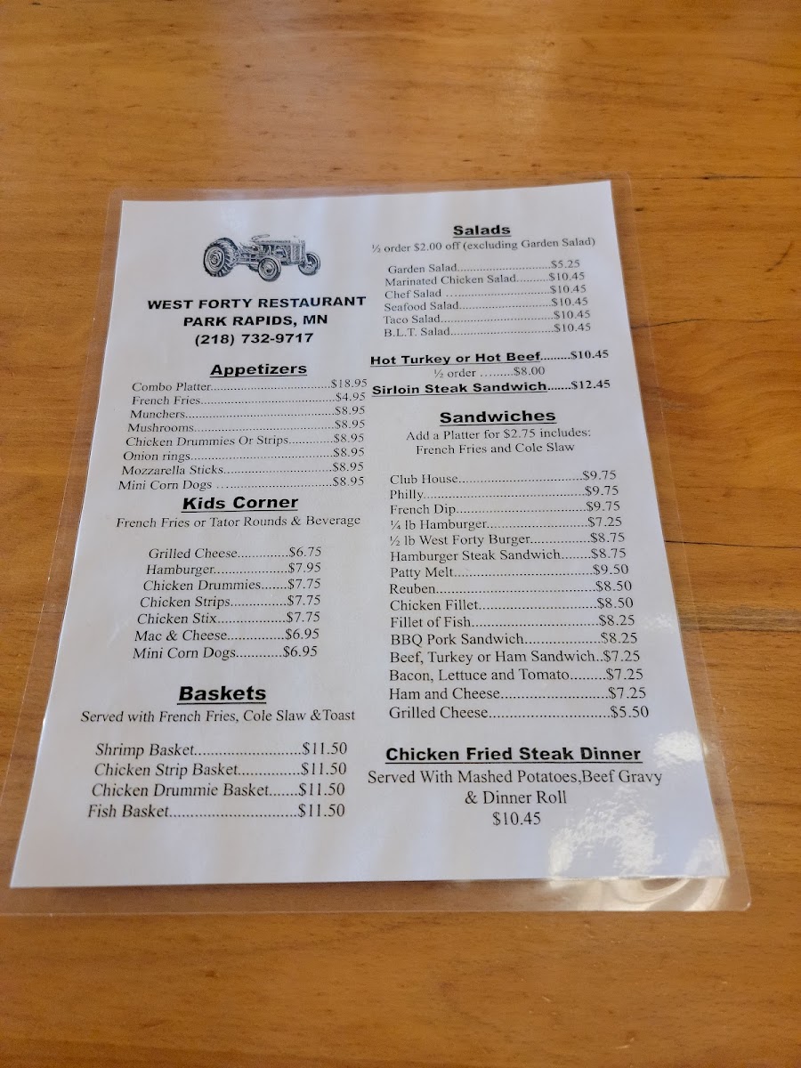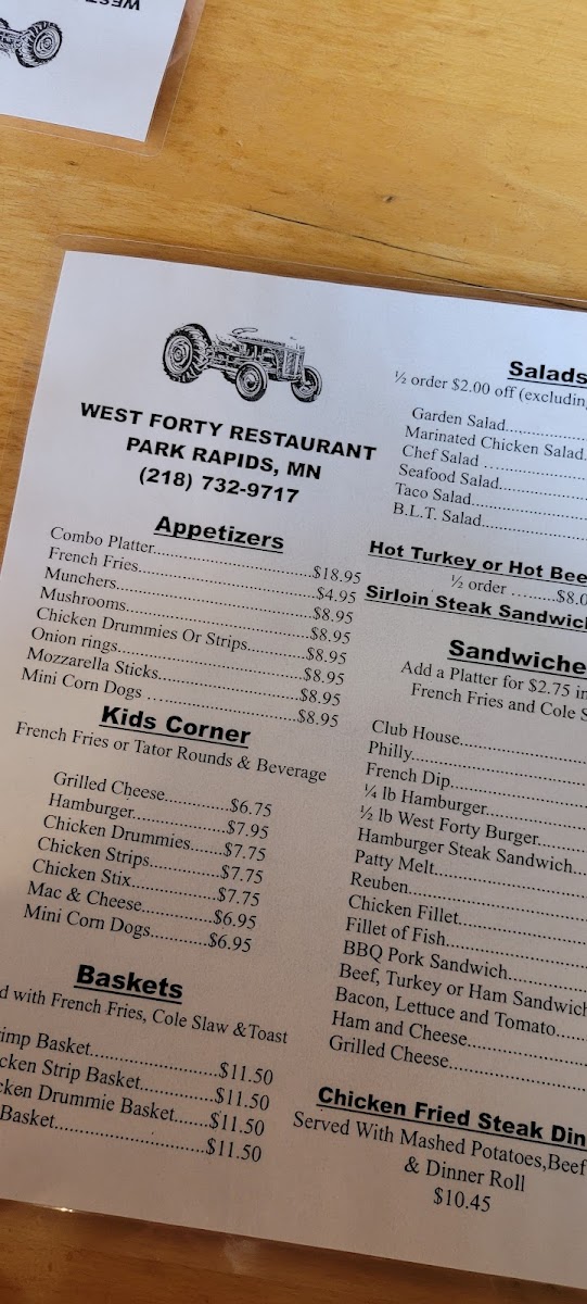 Welcome to West Forty Restaurant, a beloved gem nestled in Park Rapids, MN. Renowned for its hearty menu, this eatery specializes in breakfast favorites like the Thrasher's Breakfast and the Hired Man's Breakfast. Each dish is crafted to offer the perfect start to your day, paired with their plentiful, delicious coffee.
